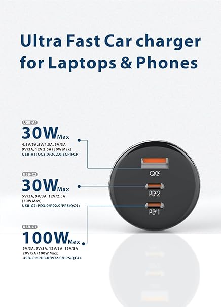 - USB-C1+USB-C2+USB-A: 100W+30W+30W, 100 W C-type to C-type super fast charging cable inside.